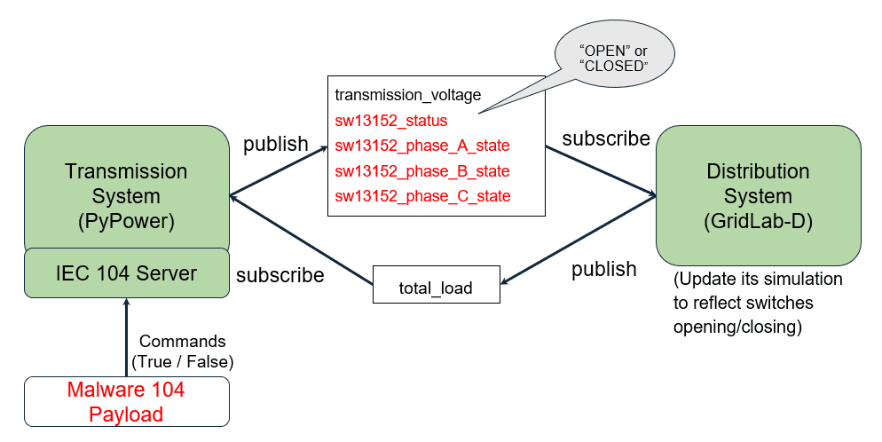 To support this work, we created a full testbed that brings together GridLAB D for distribution system simulation, a custom-built IEC 104 server for remote terminal unit behavior, and additional components modeled through the HELICS co-simulation framework. We adapted real Industroyer malware samples to run inside a virtual machine-based engineering workstation, allowing us to examine how malicious IEC 104 payloads manipulate switch states, breaker positions, and other critical controls across an emulated power distribution network.