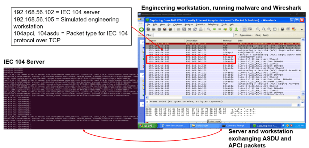 Packet level view of the engineering workstation and IEC 104 server exchanging APCI and ASDU messages, showing how the malware formats and issues unauthorized control commands.