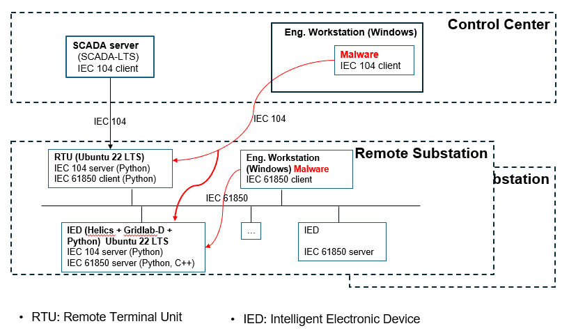 An integrated co simulation testbed combining GridLAB D, an IEC 104 server, Python based control logic, and a Windows engineering workstation running malware. This environment models realistic interactions between control center components, substations, and spoofed industrial control protocol traffic.